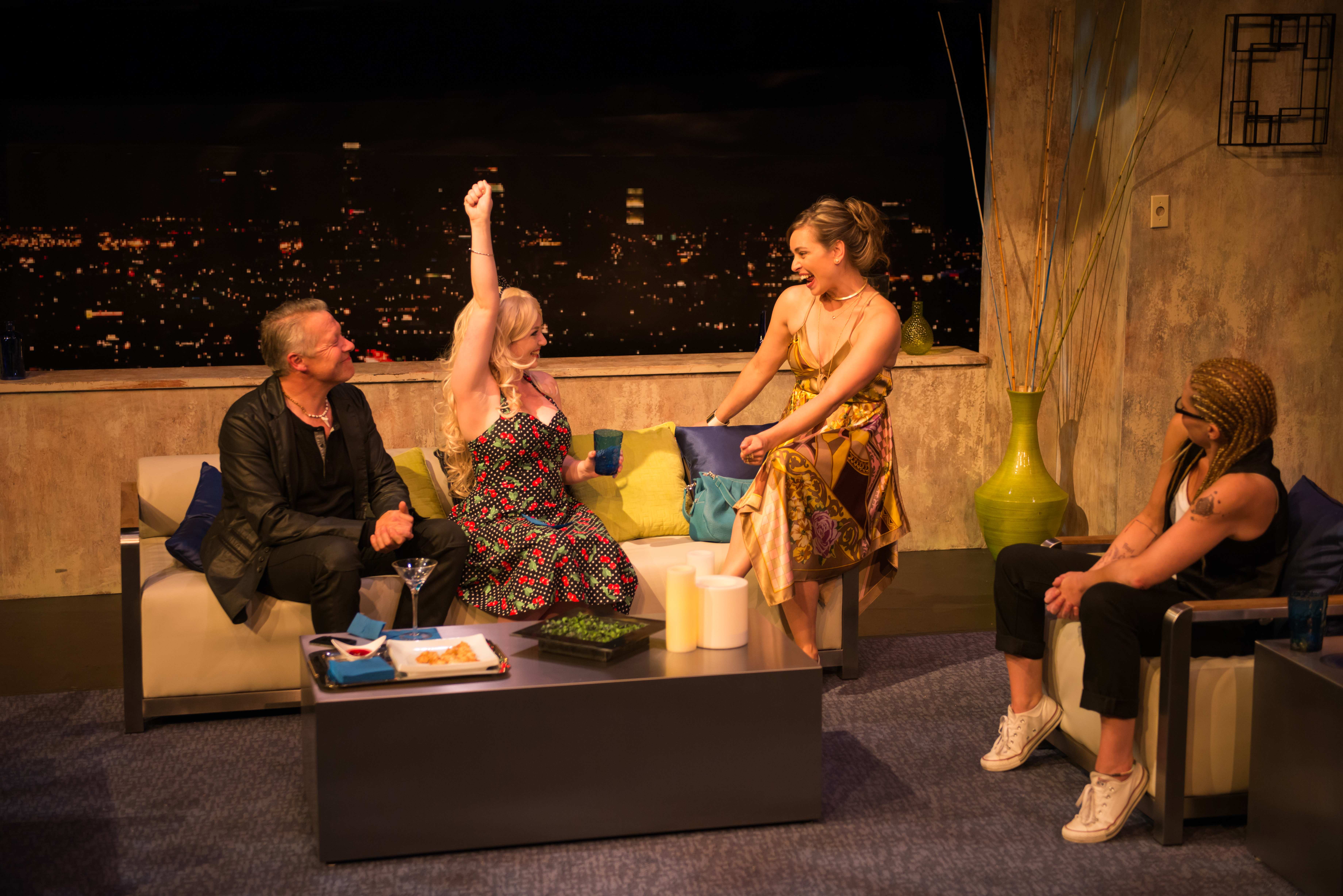 Hawley delivers both menace and an eerie allure as Laura, a most unwanted house guest. Van Belle’s vitamin-obsessed, rational thinking Greg is played with superb timing and gesture. (Perhaps Van Belle will keep his truly retro running attire since he seems so confident in them!). Unfortunately, Blizzard has difficulty in riding the emotional ups and downs of her character, lacking the sort of nuance needed in such a dynamic script as this. Blizzard does shine, though, is in her scenes with Cowling, which are real gut busters, thanks to their great chemistry together.